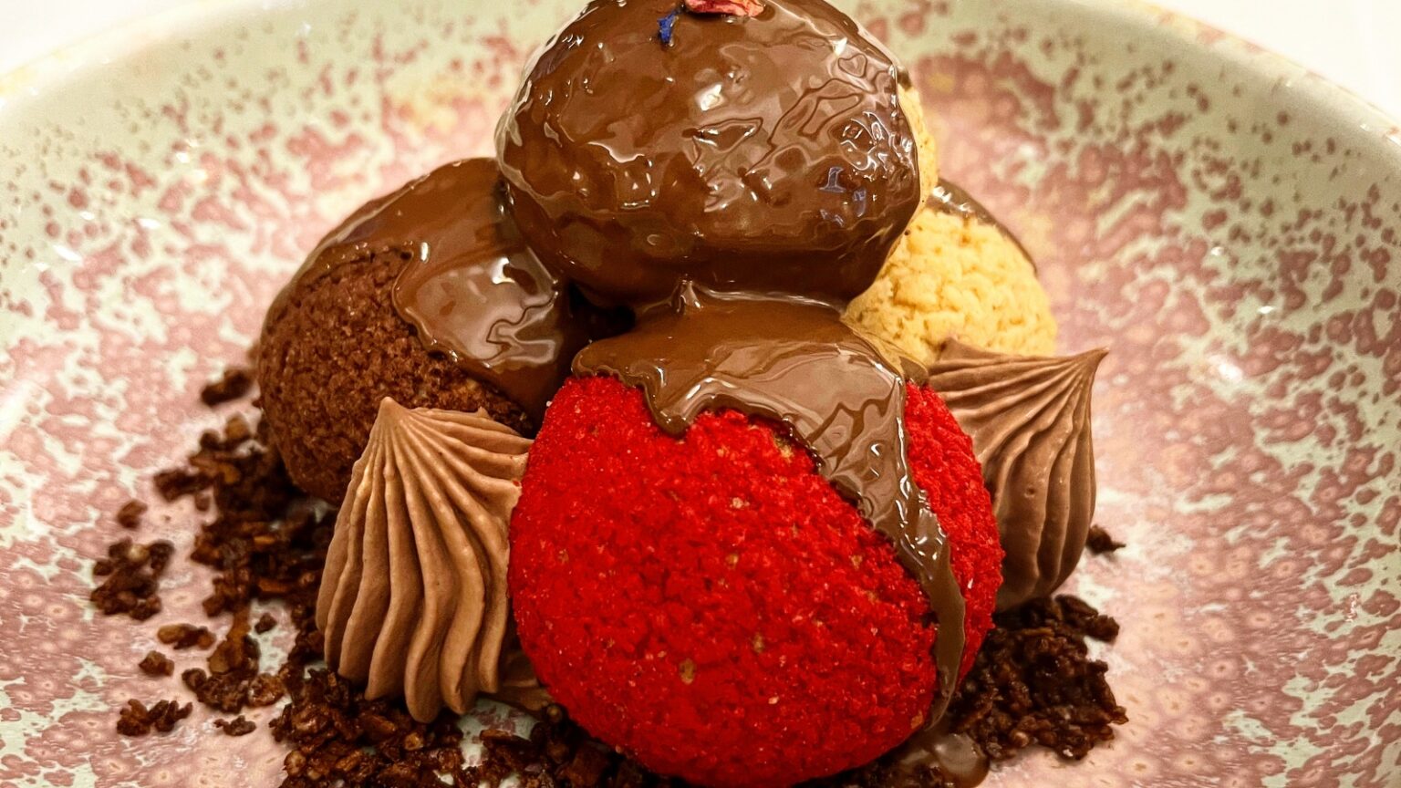 To complete your taste journey in Nea Diagonio, accompany your dishes with a wine and also with the profiteroles with namelaca chocolate 70% together with four cracker sauces filled with pastry cream, caramel cream, hazelnut crumble and chocolate sauce.