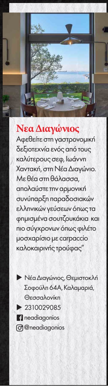Indulge in the culinary skill of one of the best chefs, Ioannis Hantakis, in Nea Diagonios. With a view of the sea, enjoy the harmonious coexistence of traditional Greek flavors such as the famous souzoukakia and more modern ones such as beef fillet with summer truffle carpaccio!